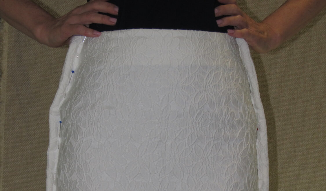 1. Надеть изделие на фигуру . Сколоть или застегнуть застёжку. Уточнить баланс изделия на фигуре совместив юбку с фигурой по линии талии, бёдер.